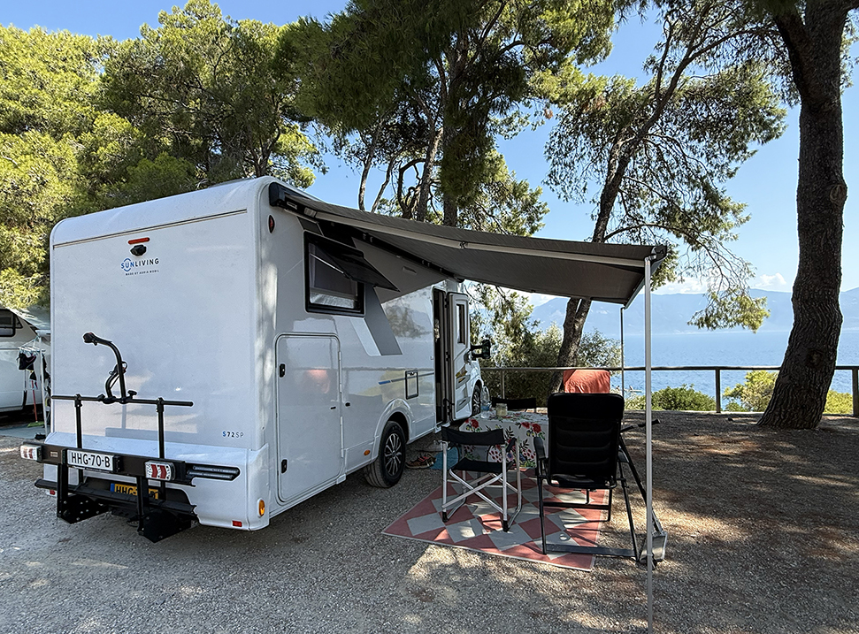 La Sun Living S 72 SP resultó ser perfecta para nosotros. Esta autocaravana perfilada mide 7,20 metros de largo, 2,30 metros de ancho y 2,87 metros de alto. Mi pareja y yo dormíamos en la cama transversal trasera, donde teníamos mucho espacio. Nuestros hijos, que cumplieron trece y dieciséis años unas semanas después, compartían la cama abatible. Los dos, que crecen como la mala hierba, tenían un poco menos de espacio que nosotros. Aun así, todo salió bien. Lo único que realmente echamos de menos en estas vacaciones fue el aire acondicionado. Hacía mucho calor en Grecia, lo que significaba que la temperatura en la autocaravana subía considerablemente por la noche, a pesar de que cerrábamos y abríamos las trampillas del techo y las ventanas a tiempo. Afortunadamente, un ventilador que habíamos cogido nos proporcionó algo de alivio. Y gracias al aire acondicionado de la cabina, se mantuvo agradable y fresco mientras viajábamos durante el día.